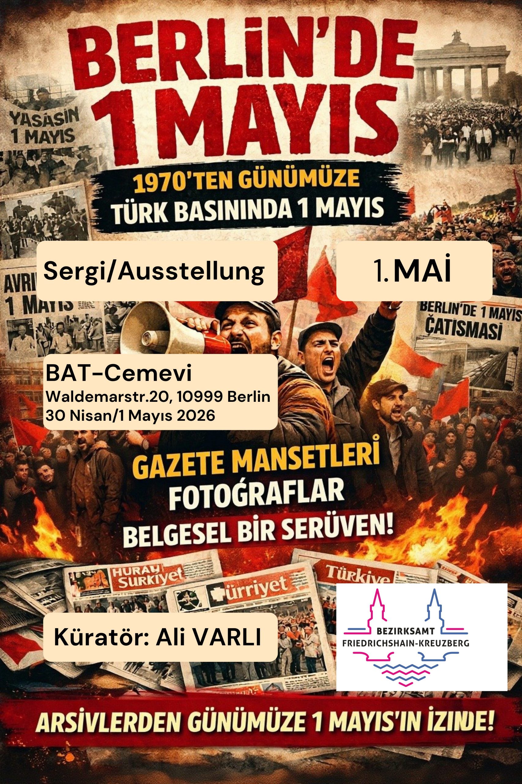 Ausstellung 1. Mai in Kreuzberg – Migration, Arbeit und Erinnerung in türkischsprachigen Zeitungen (1970–2025) 30.04.2026 – 01.05.2026 Alevitische Gemeinde zu Berlin Zum Projekt