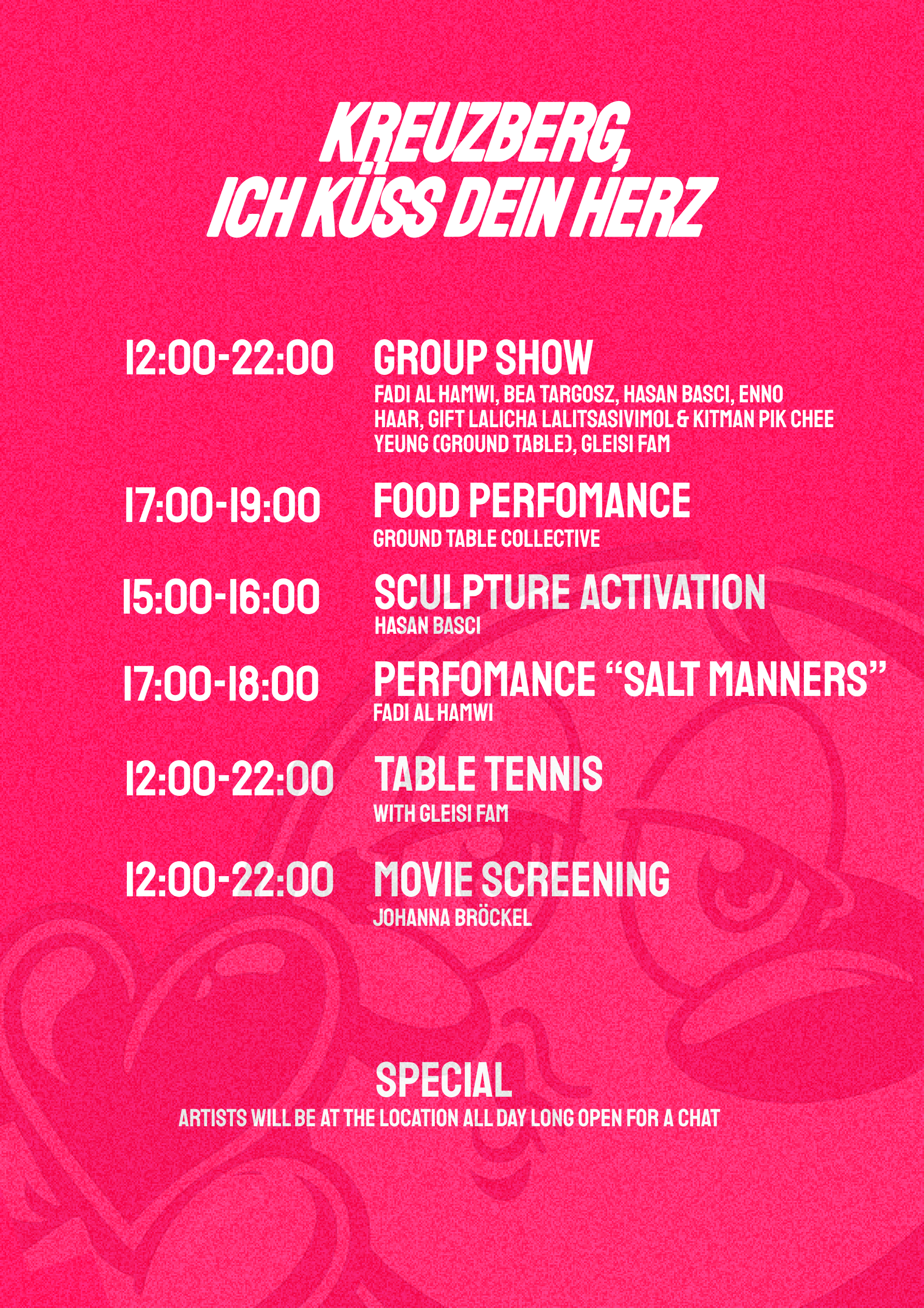 Im Rahmen von „Kreuzberg, ich küss dein Herz“ öffnet am 01. Mai von 12-22 Uhr eine Gruppenausstellung auf dem Dragonerareal (Kiezraum) Räume für neue Perspektiven auf Zugehörigkeit, Sichtbarkeit und Teilhabe. Künstlerische Arbeiten aus Film, Sound, Installation und Performance verhandeln die Ambivalenz des „Gast-Seins“ in der postmigrantischen Stadt. Die Ausstellung versteht Kunst als kollektive Praxis – als Ort der Begegnung, des Austauschs und der Teilhabe. Rundherum lädt das Festival dazu ein, gemeinsam zu spielen, zu essen und Zeit zu verbringen: mit Tischtennis, Food Performance und offenem Miteinander.