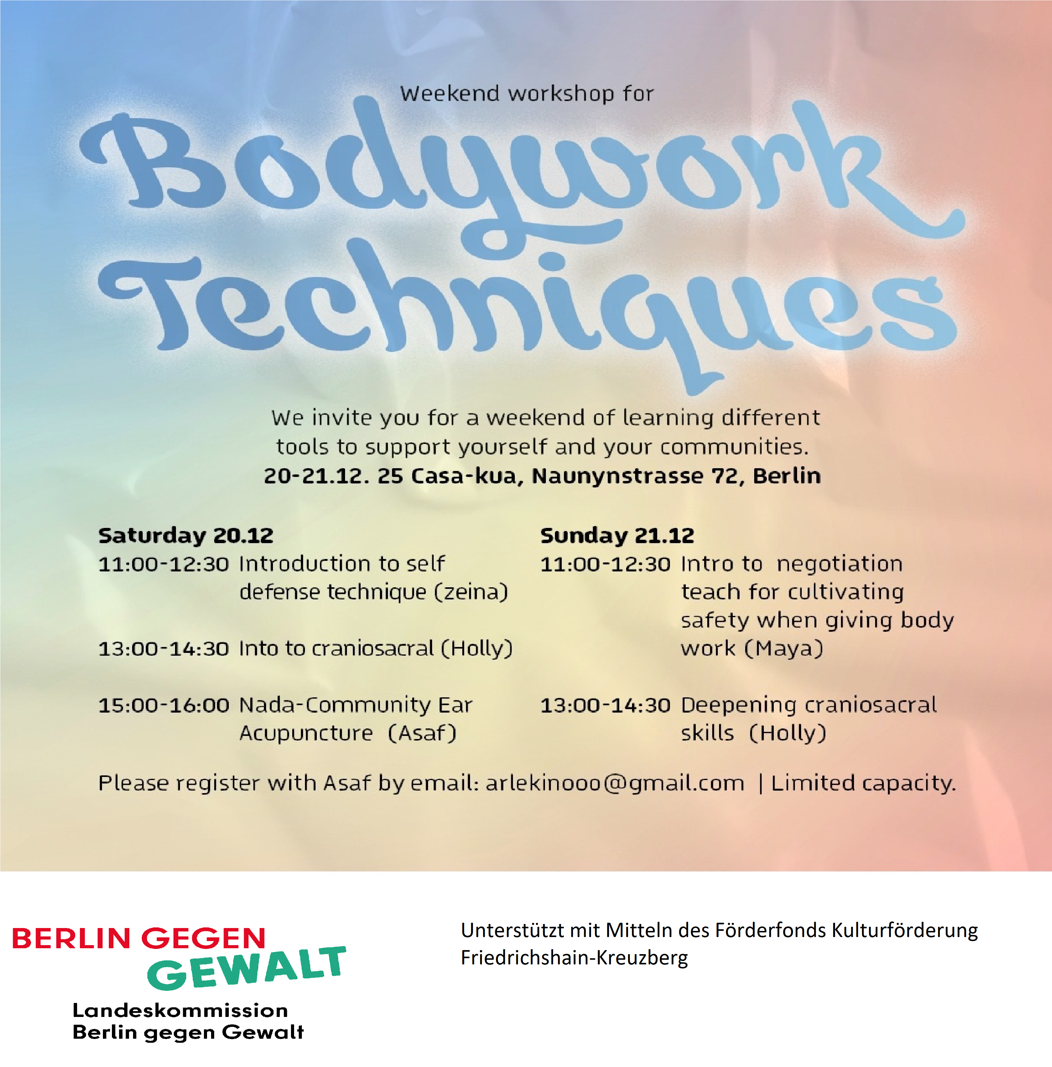 Das Programm vereint verschiedene Praktiker*innen und Methoden, die in einzelnen Workshops vorgestellt werden und in einer gemeinsamen Abschluss-Diskussion miteinander in Dialog treten. Die Workshops bieten niedrigschwellige Einführungen in Selbstverteidigung, Craniosacral-Therapie, Verhandlungsstrategien zur Schaffung von Sicherheit bei Körperarbeit sowie in NADA (National Acupuncture Detoxification Association).