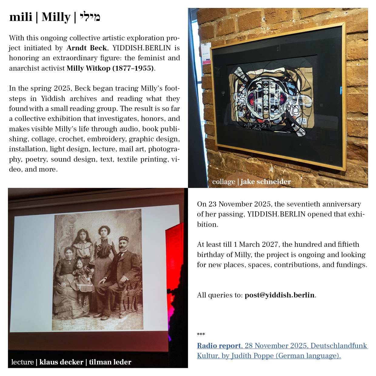 Mit der von Arndt Beck initiierten kollektiven künstlerischen Forschung ehrt YIDDISH BERLIN eine außergewöhnliche Persönlichkeit: Die Feministin und anarchistische Aktivistin Milly Witkop (1877—1955).